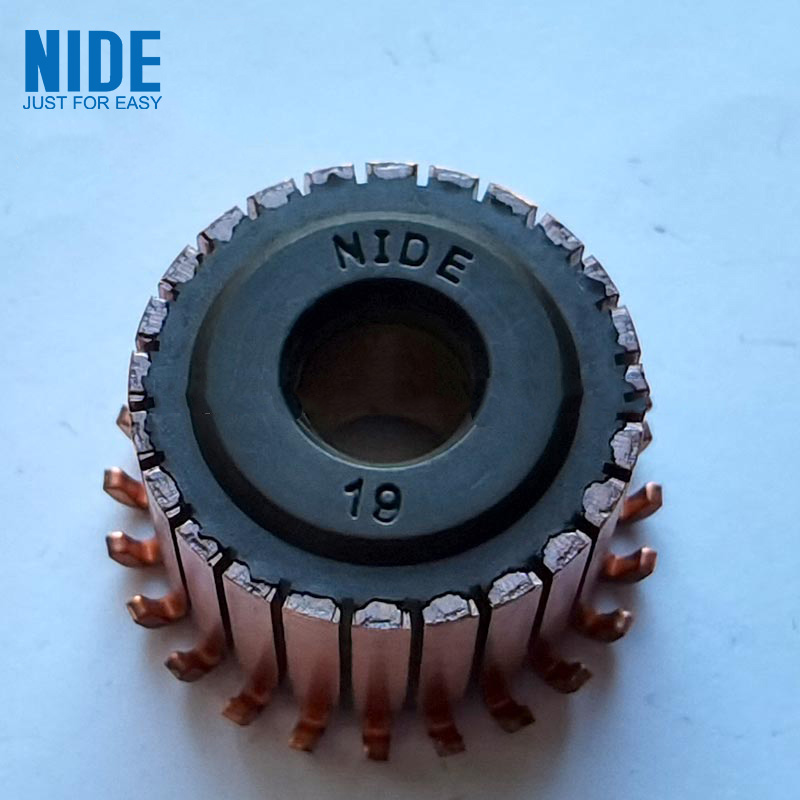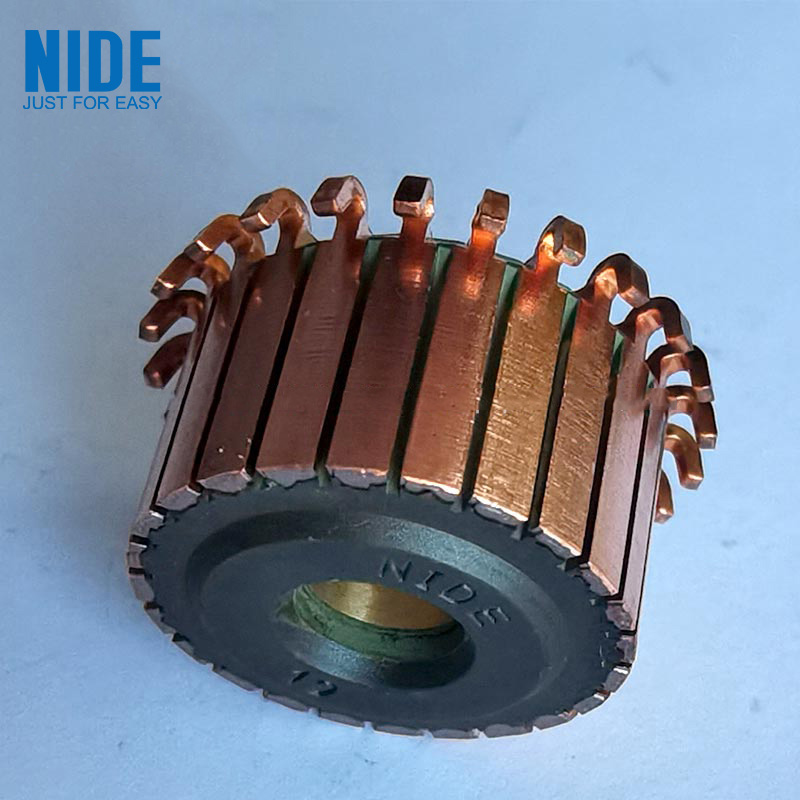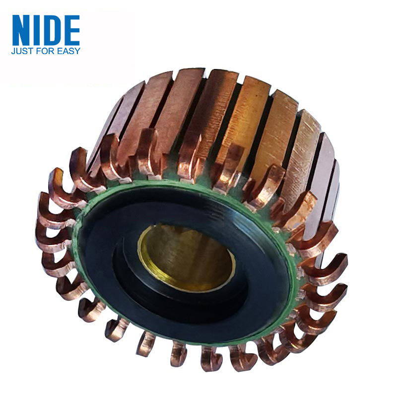 RO Pump Motor Commutator ba වලින් සාදන ලද ප්රතිලෝම පදනමක් ඇතුළත් වේke lite කුඩු ද්රව්ය සහ ප්රතිලෝම පාදයේ වට ප්රමාණය මත ඒකාකාරව සකසා ඇති කොක්ක ආකාරයේ ප්රතිලෝම තඹ පත්රයක්. කොකු ආකාරයේ ආපසු හැරවීමේ තඹ පත්රයේ ඉහළට කොක්කක් ලබා දී ඇත. ප්රතිලෝම තඹ පත්රයේ ඉහළ සහ පහළ කෙළවර පෘෂ්ඨ මත ශක්තිමත් කරන ලද මුදු කට්ට සපයා ඇති අතර යාබද කොකු ආකාරයේ ප්රතිලෝම තඹ තහඩු මයිකා තහඩු මගින් පරිවරණය කර හුදකලා කර ඇත. ලක්ෂණය වන්නේ ශක්තිමත් කිරීමේ වළල්ලේ වලක් සකස් කර ඇති ශක්තිමත් කිරීමේ වළල්ල බහු මුදු වලින් වට වී තිබීමයි. සෙරමික් පබළු ගණන කොක්ක ආකාරයේ සංක්රමණ තඹ තහඩු ගණනට සමාන වේ.